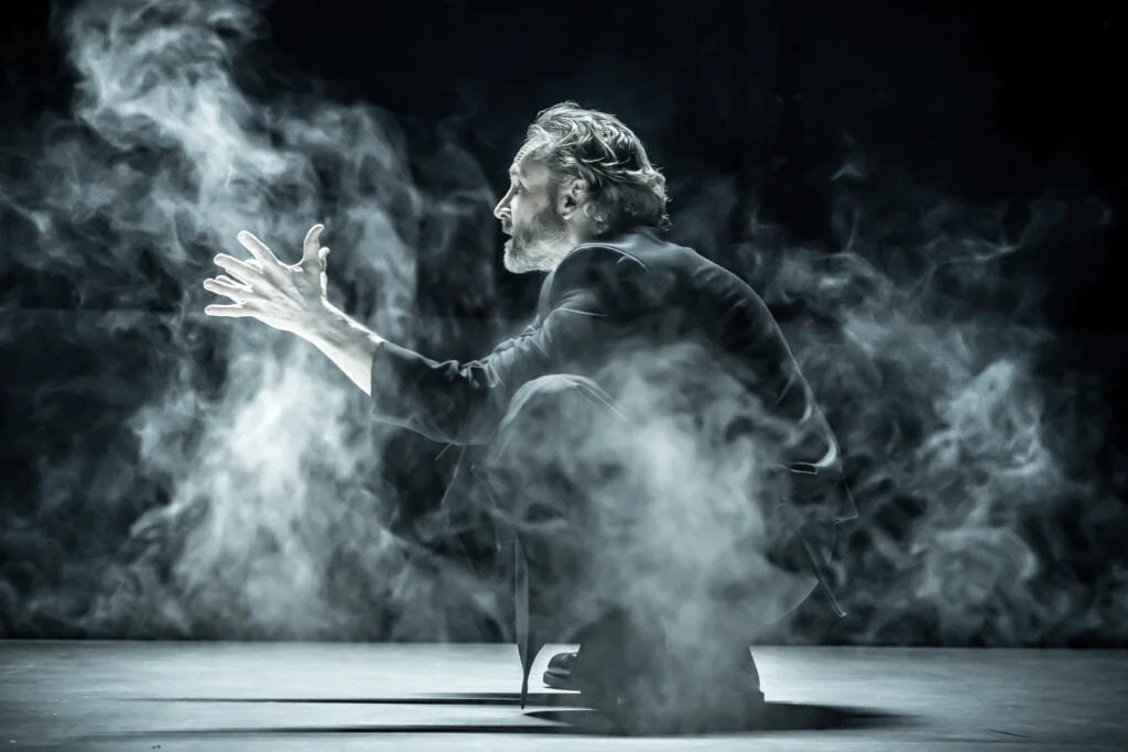 The usher said to put on the headphones which are on every seat. The note said to try out the headphones first and the message on them was to make sure they were on the left and right ears correctly. When the play started the sound came from either side and the witches were only heard not seen. Were the witches inside Macbeth (David Tennant)’s head only? Certainly the effect was eerie with these strange voices and sound effects echoing the familiar spell. Could Banquo (Cal McAninch) not also hear the witches’ predictions?