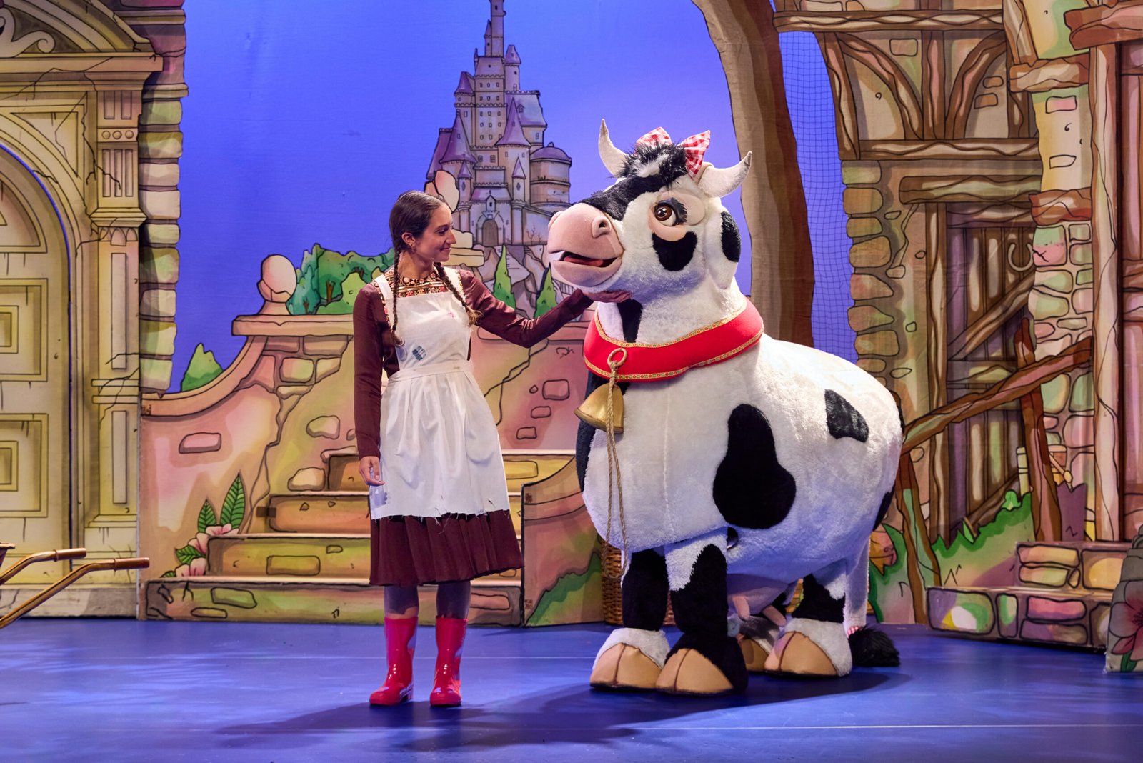 The final and most charming member of the cast is Basanti (Leela Kapil and Kuldeep Goswami) Surinder’s pet cow who can flutter her eyelashes, wiggle her ears and talk. She is udderly divine. Both Cow operatives are transformed for the ball into beautiful women in ball gowns with cow print stoles. The costumes are amazing. When we first meet the Ugly Sisters, they wear trousers printed with their own faces in columns. It is they who give Surinder the nickname Surinderella.