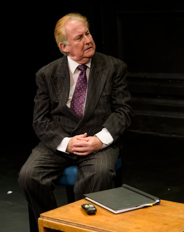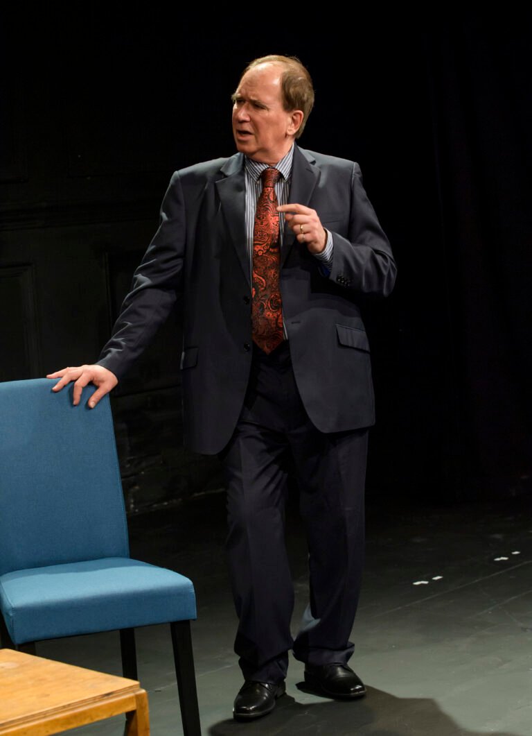 The stage, painted black, is bare except for a few chairs and a low table. A man sits, dressed in a double-breasted suit, looking regal. Another enters in off-the-peg attire. We quickly learn that the seated man is King Charles III (Clive Greenwood), and the other is the newly elected Prime Minister Max Moore (Silas Hawkins).  The King suggests informality. The Prime Minister replies, “OK, Charlie.” The King retorts, “No – you can call me Sir.” Then comes the awkwardness of the King sitting first, and the Prime Minister learning his place, he can only sit second. The tables soon turn when the Prime Minister reminds the King that he is a Constitutional monarch and must do as he’s told.