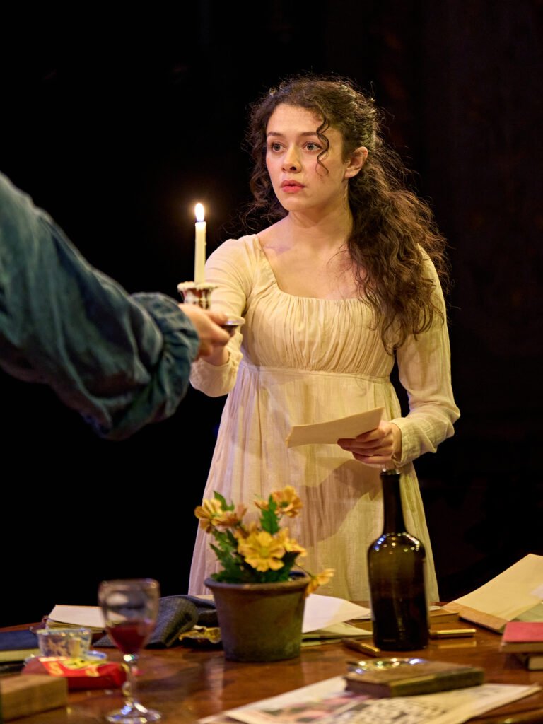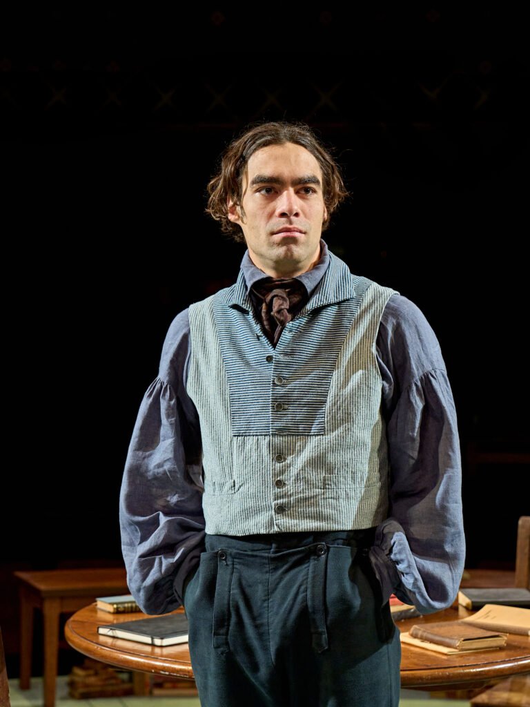 The final half hour like the circular Venn overlap in the ceiling’s set by designer, Alex Eales, has characters from both time periods on stage but playing separate scenes. The theatre is in its circular formation with the set able to revolve, a simple round mahogany table forming the centrepiece in both eras. Suzanne Cave’s costumes are lovely although the production photos are rather dark as a result of the sudued and often candle lit lighting.