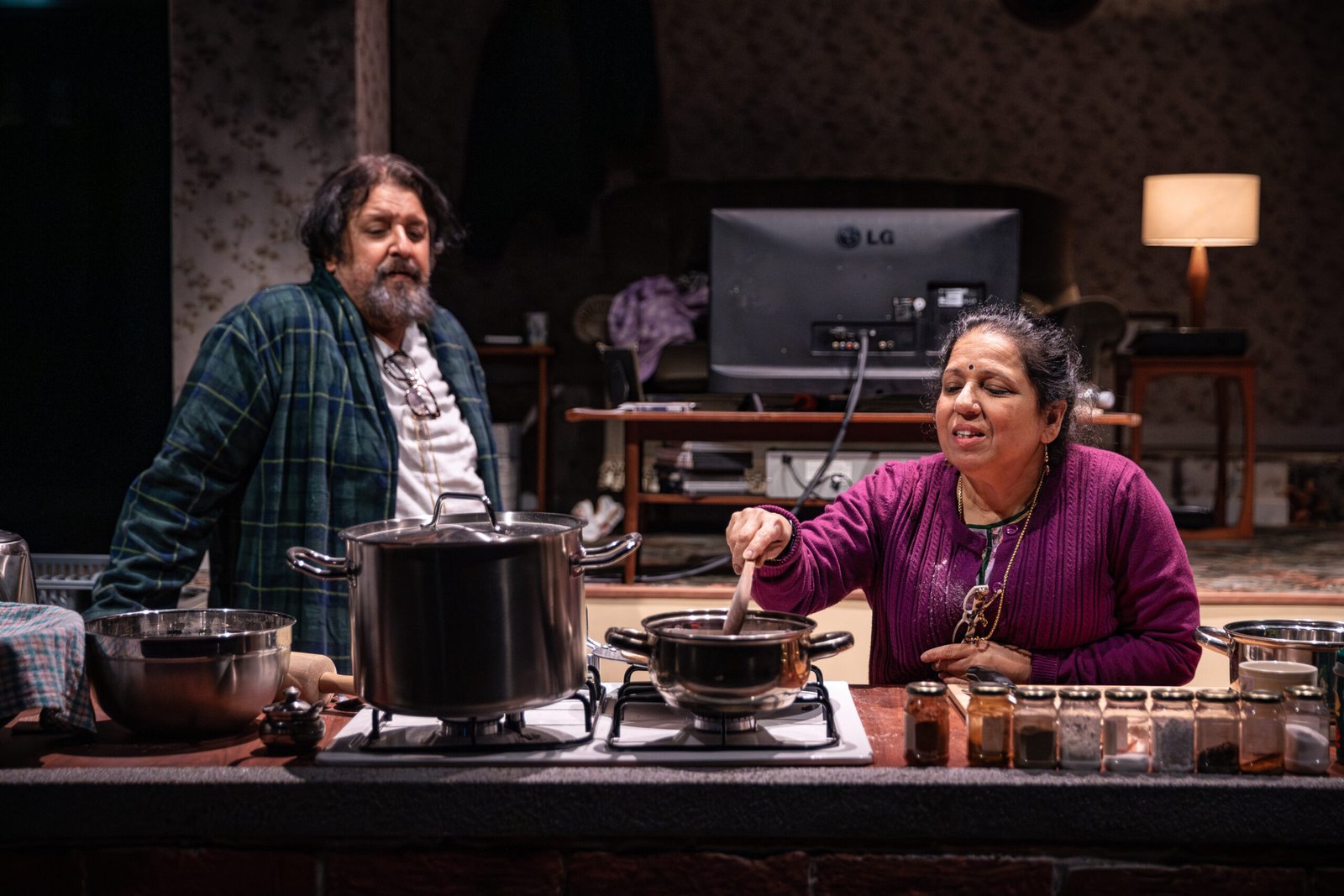 This is a joint production from the South Asian company, Tara Theatre, with their artistic director Natasha Kathi-Chandra directing, along with the Bush Theatre. Aldo Vázquez’s set, to the left, has Liaquat’s sitting room and kitchen with his late wife’s collection of stainless steel pans on a gas hob burning blue when lit. To the right is Hema’s sitting room but in front the anonymity of a few plastic chairs for the workshop space.