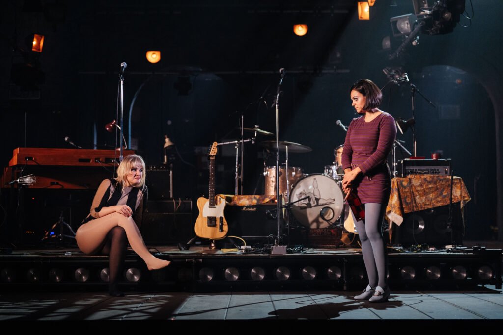 The lead singer Maggie Frisby (Rebecca Lucy Taylor) is a burnout drug user now an alcoholic. She has to be carried onto the stage at the start and is assumed to be dead at the end of the set. The stage is a movable dais with lights to the audience, above the performers and below, a very typical staging of the time by Designer Chloe Lamford .
